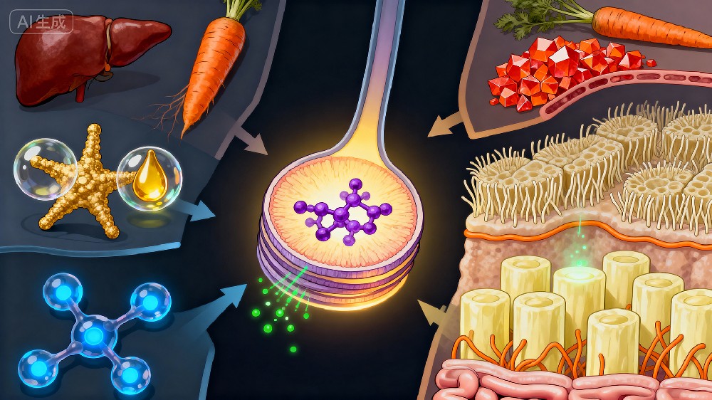 与维生素A代谢密切相关的基因包括BCMO1(影响β-胡萝卜素向视黄醇的转化效率,是最关键的基因)、RBP4(视黄醇结合蛋白基因,影响维生素A运输)、TTR(转甲状腺素蛋白基因,参与视黄醇复合物的转运)、LRAT和RDH10(参与视黄醇酯化与代谢),这些基因的多态性可能导致个体在维生素A利用能力上的差异。